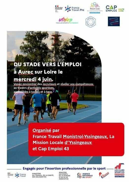 France Travail Monistrol/Yssingeaux, Mission Locale Jeunes Loire et ses Rivières et Cap Emploi 43, organisent en partenariat avec l'UFOLEP (Association sportive multisports) Le STADE VERS L'EMPLOI
